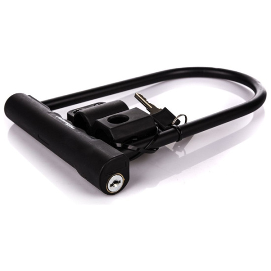 Tělo zámku je vyrobené z tvrzené oceli odolné proti povětrnostním vlivům. Jeho třmen je z kalené oceli s osmiúhelníkovým profilem o průměru 12 mm. Vinylový potah třmenu zabraňuje poškrábání laku. Zámek obsahuje diskovou cylindrickou vložku odolnou proti vyhmatání a dvojitou západku odolnou proti vypáčení. Navíc krytka klíčové dírky zabraňuje vniknutí nečistot. Součástí balení je držák pro praktické skladování a 2 ks klíčů.