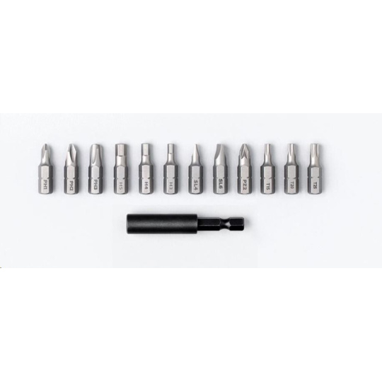 - Obsah balení: 1x Šroubovák, 1x Úložný vak, 1x Manuál, 1x Zásobník bitů, 1x Prodlužovací tyč, 12x Bit, 1x Nabíjecí kabel