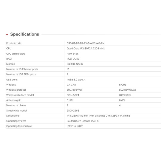 Switch, který umí víc než jen přepínat. Nyní s nejvýkonnějším 4x4 MIMO Wi-Fi 6 a dostatečným výkonem i pro směrování! Hlavní vlastnosti: 16× Gigabit Ethernet portů (8× s PoE-out) 2× 10G SFP+ porty PoE-out – celkový výkon až 150 W Výkonný čtyřjádrový ARM CPU 2,2 GHz 1 GB RAM, 128 MB NAND L3 HW Offloading USB 3.0 typu A Gigabit management port přímo napojený na CPU Dual-band 4x4 MIMO Wi-Fi 6 (2,4 GHz & 5 GHz) Redundantní napájení (2× AC vstup) RouterOS v7 (Licence L5) Technické specifikace: CPU: Quad-Core IPQ-8072A, 2208 MHz Architektura CPU: ARM 64bit RAM: 1 GB DDR3 Úložiště: 128 MB NAND Ethernet porty: 17× 1G SFP+ porty: 2× 10G USB: 1× USB 3.0 Typ A Switch čip: 98DX226S Wi-Fi 2,4 GHz: 802.11b/g/n/ax (QCN-5024, 4×4, zisk 5 dBi) Wi-Fi 5 GHz: 802.11a/n/ac/ax (QCN-5054, 4×4, zisk 6 dBi) Rozměry: 44 × 250 × 443 mm (s anténami 210 × 250 × 443 mm) Operační teplota: -20 °C až +70 °C Napájení: 2× AC vstup 100–240 V Max. spotřeba (bez zátěže): 43 W Max. spotřeba (celkem): 227 W PoE-out: 802.3af/at, 24V Passive, porty Ether9–Ether16 Max. výstup na port: 1,1 A (<30 V), 0,56 A (>30 V) Celkový výkon PoE: 150 W Balení obsahuje: napájecí kabel, montážní sadu. Upozornění: Výrobce MIKROTIK nevztahuje záruku na zařízení poškozená přepětím. Zařízení je třeba na vstupech adekvátně chránit proti indukovanému elektrostatickému přepětí či přepěťovým špičkám na silovém vedení. Při venkovních instalacích je třeba používat stíněnou kabeláž (FTP/SFTP), příslušné přepěťové ochrany (pokud nejsou integrovány) a provést korektní a efektivní uzemnění. Zařízení vždy provozujte s poslední výrobcem publikovanou verzí (výrobcem označenou "Stable") operačního systému RouterOS. Taková verze garantuje nejoptimálnější funčknost, obsahuje opravené chyby z verzí předchozích a výkonová vylepšení. .