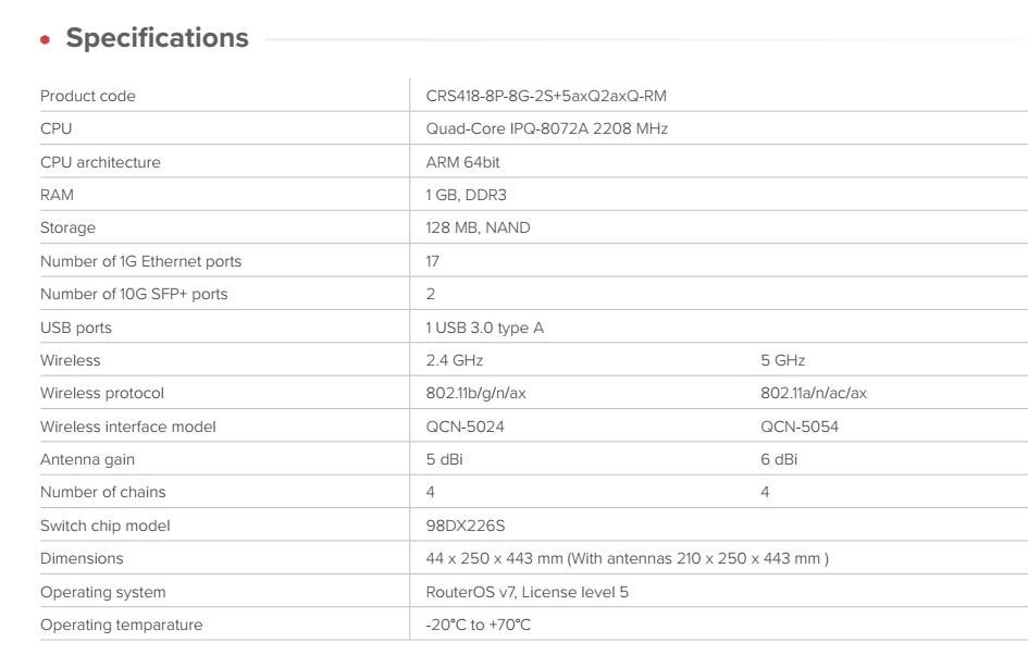 Switch, který umí víc než jen přepínat. Nyní s nejvýkonnějším 4x4 MIMO Wi-Fi 6 a dostatečným výkonem i pro směrování! Hlavní vlastnosti: 16× Gigabit Ethernet portů (8× s PoE-out) 2× 10G SFP+ porty PoE-out – celkový výkon až 150 W Výkonný čtyřjádrový ARM CPU 2,2 GHz 1 GB RAM, 128 MB NAND L3 HW Offloading USB 3.0 typu A Gigabit management port přímo napojený na CPU Dual-band 4x4 MIMO Wi-Fi 6 (2,4 GHz & 5 GHz) Redundantní napájení (2× AC vstup) RouterOS v7 (Licence L5) Technické specifikace: CPU: Quad-Core IPQ-8072A, 2208 MHz Architektura CPU: ARM 64bit RAM: 1 GB DDR3 Úložiště: 128 MB NAND Ethernet porty: 17× 1G SFP+ porty: 2× 10G USB: 1× USB 3.0 Typ A Switch čip: 98DX226S Wi-Fi 2,4 GHz: 802.11b/g/n/ax (QCN-5024, 4×4, zisk 5 dBi) Wi-Fi 5 GHz: 802.11a/n/ac/ax (QCN-5054, 4×4, zisk 6 dBi) Rozměry: 44 × 250 × 443 mm (s anténami 210 × 250 × 443 mm) Operační teplota: -20 °C až +70 °C Napájení: 2× AC vstup 100–240 V Max. spotřeba (bez zátěže): 43 W Max. spotřeba (celkem): 227 W PoE-out: 802.3af/at, 24V Passive, porty Ether9–Ether16 Max. výstup na port: 1,1 A (<30 V), 0,56 A (>30 V) Celkový výkon PoE: 150 W Balení obsahuje: napájecí kabel, montážní sadu. Upozornění: Výrobce MIKROTIK nevztahuje záruku na zařízení poškozená přepětím. Zařízení je třeba na vstupech adekvátně chránit proti indukovanému elektrostatickému přepětí či přepěťovým špičkám na silovém vedení. Při venkovních instalacích je třeba používat stíněnou kabeláž (FTP/SFTP), příslušné přepěťové ochrany (pokud nejsou integrovány) a provést korektní a efektivní uzemnění. Zařízení vždy provozujte s poslední výrobcem publikovanou verzí (výrobcem označenou "Stable") operačního systému RouterOS. Taková verze garantuje nejoptimálnější funčknost, obsahuje opravené chyby z verzí předchozích a výkonová vylepšení. .