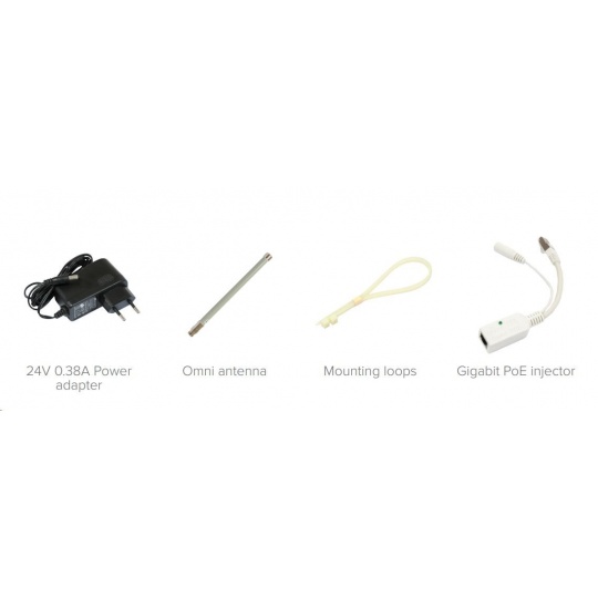 Balení obsahuje: RouterBOARD RBGrooveGA-52HPacn, PoE injektor, napájecí zdroj, montážní sada, anténa 6dBi omni
