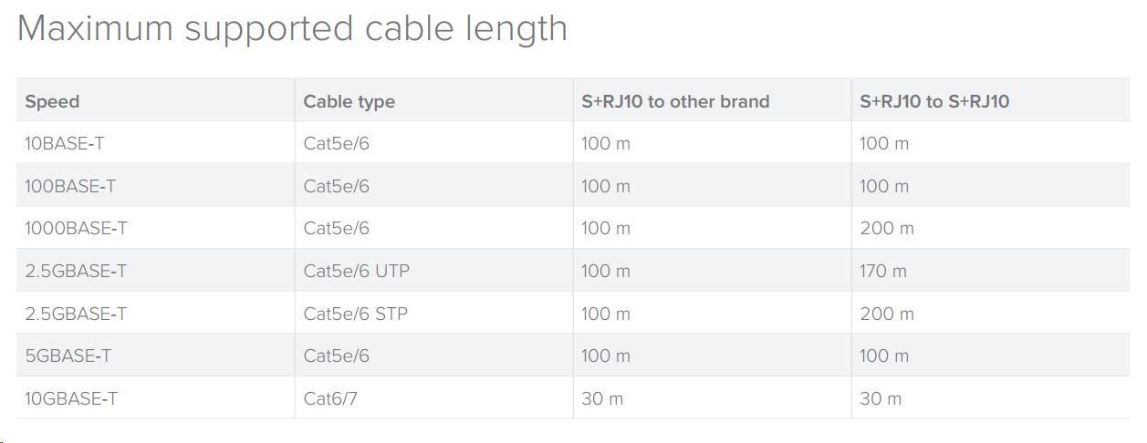 | 2.5GBase-T | Cat5e/6 STP | 100m | 200m |