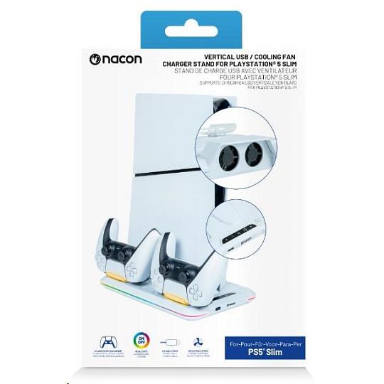 Umístěte svou herní konzoli PlayStation 5 Slim na tento víceúčelový vertikální podstavec od společnosti Nacon. Ten je kompatibilní s diskovou i digitální verzí této konzole a kromě dvou větráčků a jednoho portu USB-A na něm najdete také dvě kolébky sloužící k nabíjení herních ovladačů DualSense, přičemž o stavu jejich nabíjení vás informuje barevné podsvícení pod jednotlivými ovladači.