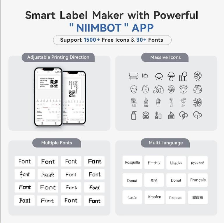 Při navrhování štítku můžete použít různá písma, tvary, ikony, velikosti a formáty, abyste si vytiskli etikety nebo štítky podle své představy. Můžete importovat fotografie z vašeho telefonu nebo obrázky z internetu, aby byl design jedinečnější. Bezplatná aplikace pro iOS nebo Android nabízí více než 1500 ikonek, více než 100 rámečků, 19 fontů písma a umožňuje také tisk QR kódů. Můžete si vybrat z různých stylů písma, velikostí a formátů, abyste si vytiskli etikety nebo štítky přsně podle své představy. Tiskárna automaticky rozezná vložené etikety a aplikace přizpůsobí rozměry pro tisk.