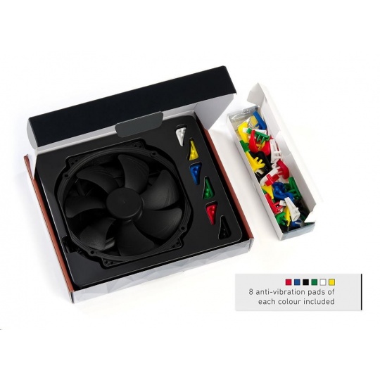 ventilátor, tichý, rozměry 140x150x25mm, průtok 140.2 m3/h, 300 až 1500 otáček, SSO2, 4pin PWM, s vyměnitelnými barevnými antivibračními podložkami