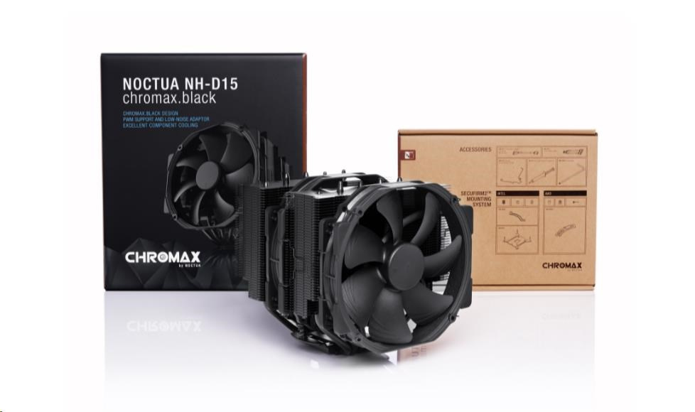 NH-D15 chromax.black je černá verze oceněného modelu NH-D15, špičkového tichého chladiče procesoru společnosti Noctua. Díky stejné osvědčené konstrukci chladiče dual-tower a ventilátorům NF-A15 PWM zůstává věrný úspěšnému NH-D15, který se vyrovná výkonu vodních chladičů typu all-in-one při zachování vynikajícího tichého provozu. Verze chromax.black s černými ventilátory a chladičem s černým povrchem zároveň kombinuje tyto přednosti s elegantním stealth vzhledem. NH-D15 chromax.black, doplněný o proslulý systém montáže SecuFirm2 do více socketů, tepelnou směs Noctua NT-H1 pro nadšence a plnou 6letou záruku výrobce, je luxusní volbou pro overclockery i tiché nadšence, kteří hledají chladič elitní třídy, který vypadá stejně skvěle jako chladí.
