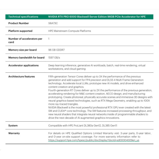 NVIDIA RTX PRO 6000 Blackwell Server Edition 96GB PCIe Accelerator for HPE.