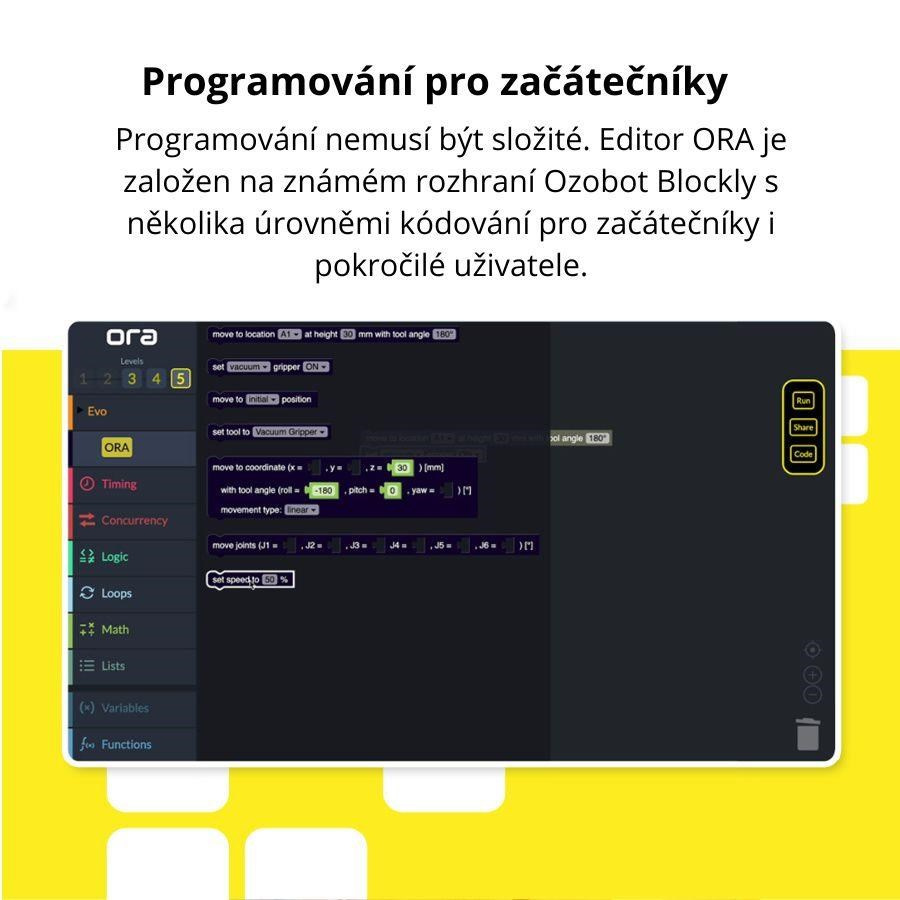 Při výšce téměř tři čtvrtě metru má plně vysunuté rameno ORA poloměr dosahu 440 mm. Je vybaveno prstovým a vakuovým úchopem, aby bylo schopno zvedat, přemisťovat a manipulovat s předměty ve svém okolí. Díky šesti nezávisle ovladatelným osám mohou studenti naprogramovat ORA tak, aby pracovala v téměř libovolné poloze a splnila jakýkoli úkol nebo výzvu, se kterou se setkají. Díky konstrukci plug and play lze kobota snadno zprovoznit pomocí přiloženého napájecího zdroje, nouzového zastavení a montážního příslušenství. Ani jeho programování není neřešitelným rébusem. Programy pro robotické rameno budete vytvářet v blokovém Ozobot Editoru, který je založen na známém rozhraní Ozobot Blockly. Rozlišuje několik úrovní kódování, aby práci v něm zvládli jak začátečníci, tak i pokročilí uživatelé. Tento editor lze také přepnout do programovacího jazyka Python.