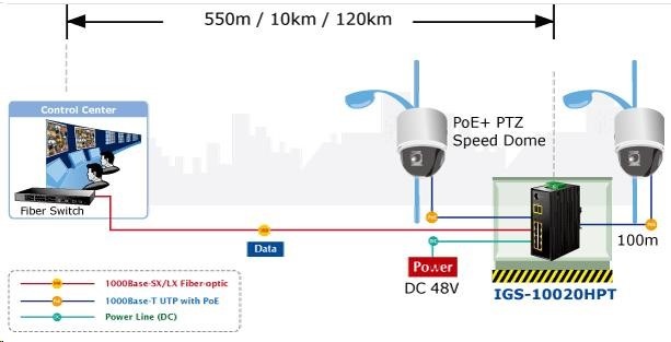 Planet IGS-10020HPT PoE switch 8x 1000Base-T, 2x SFP, 802.3at 270W, IP30, -40 až 75°C, SNMP, IGMPv3, IPv6 Inteligentní přepínače pro průmyslový Ethernet jsou určeny do náročných provozních podmínek s velkým rozsahem pracovních teplot, nejistým napájením a častými otřesy. Zároveň poskytují vynikající možnosti vícenásobných propojení pro dosažení robustnosti propojení systémů s velmi nízkou dobou zotavení. IGS-10020HPT je vybaven pro redundanci kromě dobře známé metody Spanning Tree (jejíž doba zotavení je v řádu sekund) především specializovanou funkcí "Redundant ring" která má dobu zotavení a nalezení nové cesty do 300ms. Jako PoE přepínač umožňuje přímo napájet až 8 koncových zařízení dle normy IEEE 802.3at, je tak ideálním prvkem pro aplikace se sníženou možností napajení. Přepínače řady IGS se snadno instalují na standardní DIN lištu nebo přímo na zeď a umožňují nasazení dobře známé Ethernetové technologie i v průmyslovém prostředí. Stejně tak jsou vhodné pro instalace do venkovně umístěných skříní s velkým kolísáním pracovních teplot (typicky bezdrátové a MAN ISP aplikace). Vlastnosti: - 8 portů 1000Base-T, Switching, Full Duplex (1000/2000 Mbps), Auto-Negotiation (10/100/1000 Mbps), automatická detekce přímý/křížený kabel na každém portu - na všechny implementace PoE IEEE 802.3at injektory se zatížitelností 30W/port, celkově až 270W - 2 porty SFP pro instalaci modulů 1000Base-SX/LX/BX nebo 100Base-FX - propustnost: sběrnice 20Gbps, 14,8Mp/s (64B) - podpora Jumbo Frame do 9kB, 8k MAC adres, buffer 4Mbity - 255 VLAN IEEE 802.1Q sítí, MAC nebo protocol based VLAN, VoIP VLAN - agregace linek "port trunking" IEEE 802.3ad LACP - IGMP v1,v2,v3 až do 256 multicast skupin, IGMP querier mode - 8-úrovní QoS prioritizace provozu dle portu, DSCP/ToS, 802.1p nebo 802.1Q značky - podpora Spanning Tree IEEE 802.1d, Rapid Spanning Tree IEEE 802.1w - IP/MAC ACL (access control list) do 123 pravidel, MAC/IP binding - DHCP snooping - port shaper - administrace Web/SNMPv3 s podporou zabezpečeného přenosu SSH/SSL - podpora IPv4/IPv6 - PoE scheduler pro možnost zapínání/vypínaní napájení podle časového plánu - pole LED indikátorů pro diagnostiku provozu - instalace na DIN lištu, montážní díl součástí - instalace na zeď, montážní díl součástí - krytí IP30 - napájení: 48V DC redundantní, připojení možné ze dvou různých zdrojů (nejsou součástí balení); vlastní příkon do 30W - ochrana proti přepólování, připojení napájení na svorkovnici, umístění na spodním panelu (nepřekáží při montáži na zeď) - přepěťová ochrana napájení do 6kV proti napěťovým špičkám (EFT) - přepěťová ochrana LAN portů do 6kV proti elektrostatickému náboji (ESD) - spínací poplachové relé (24V/1A) při výpadku primárního napájení - zařízení je odolné proti pádu (IEC-60068-2-32) z výšky 75cm na všechny dopadové části - zařízení je odolné proti vibracím (IEC-60068-2-6) 10-500-10Hz, 4x g, 0,5oct/min - zařízení je odolné proti přetížení krátkodobému zrychlení 50g, dlouhodobému 4g, (IEC-60068-2-27) - EMI/EMS, elektromagnetická kompatibilita a slučitelnost dle CE EN-6100-4-2,3,4,5,6 - elektrická bezpečnost dle CE EN-60950 - pracovní teplota -40 až 75°C, vlhkost do 95% - hmotnost: 1684g - rozměry: 152 x 107x 72 mm.