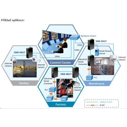 5-ti portový přepínač 10/100Base-TX pro průmyslové aplikace. Možnost redundantního napájení v rozsahu 12-48V, krytí IP30, hliníková skříň, rozšířený rozsah pracovní teploty -40 až 75 st. C. Montáž na DIN lištu nebo přímo na zeď. Automatická detekce 10/100Mbps, full duplex, 2k MAC adres, detekce přímý/křížený kabel..... více