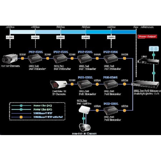 Řešení proudloužení segmentu ethernet včetně zvětšení dosahu napájení PoE (power over ethernet). Jedná se o jednoduché zařízení dovolující prodloužit maximální délku ethernet segmentu ze 100m na 200m nebo až 500m včetně zachování napájení IEEE 802.3at zařízení na konci vedení. Aplikace extenderu je ideální v místě použití IP kamer nebo bezdrátových přístupových bodů na jejich delší přípojné vzdálenosti. Cenově se tak jedná o levné rozšíření možnosti instalovat napájená zařízení do míst vzdálenějších od centrálního switche nebo racku. Použití spočívá v jednoduchém vložení extenderu na přerušené vedení. - rozhraní 10/100/1000 Base-T s IEEE 802.3at / 802.3af PoE, Auto MDI/MDI-X, Auto-Negotiation, RJ-45 - propustnost: až 1488000 paketů/s - maximální délka rámce: 1552 Bajtů - ochrana proti přepětí: do 2kV - rozměry: 94 x 70 x 26mm - hmotnost: 197g - napájení: PoE 802.3at na vstupu extenderu, vlastní příkon do 3,2W - FCC (Part 15, Class A), CE - provozní teplota: -10 až 60°.