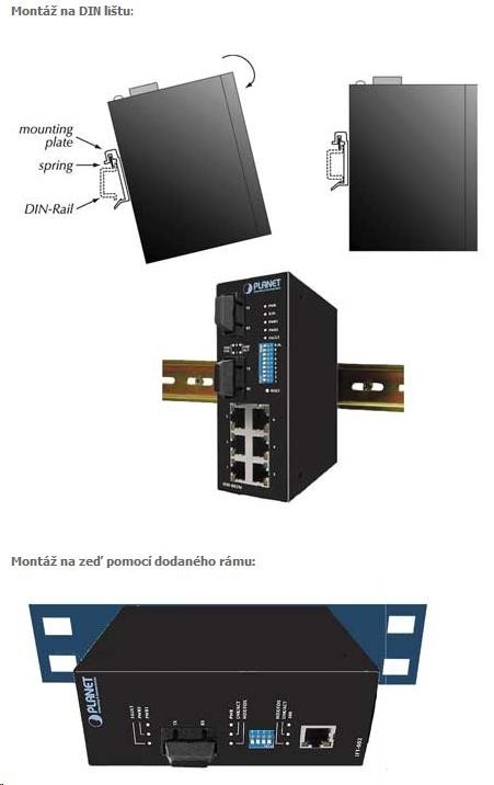 Vlastnosti: - 8 portů 1000Base-T, Switching, Full Duplex (1000/2000 Mbps), Auto-Negotiation (10/100/1000 Mbps), automatická detekce přímý/křížený kabel na každém portu - propustnost sběrnice 16Gbps, podpora Jumbo Frame do 9kB, 8k MAC adres - pole LED indikátorů pro diagnostiku provozu - instalace na DIN lištu, montážní díl součástí - instalace na zeď, montážní díl součástí - krytí IP30 - napájení: 12-48V DC redundantní, připojení možné ze dvou různých zdrojů (nejsou součástí balení) - ochrana proti přepólování, připojení napájení na svorkovnici, umístění na spodním panelu (nepřekáží při montáži na zeď) - přepěťová ochrana napájení do 6kV proti napěťovým špičkám (EFT) - přepěťová ochrana LAN portů proti elektrostatickému náboji do 6kV (ESD) - zařízení je odolné proti pádu (IEC-60068-2-32) z výšky 75cm na všechny dopadové části - zařízení je odolné proti vibracím (IEC-60068-2-6) 10-500-10Hz, 4x g, 0,5oct/min - zařízení je odolné proti přetížení krátkodobému zrychlení 50g, dlouhodobému 4g, (IEC-60068-2-27) - EMI/EMS, elektromagnetická kompatibilita a slučitelnost dle CE EN-6100-4-2,3,4,5,6 - elektrická bezpečnost dle CE EN-60950 - pracovní teplota -40 až 75 st. C, vlhkost do 95% - příkon 13,2W - rozměry 135 x 87 x 32 mm.