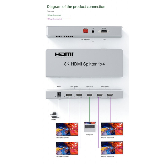 - Přepínač a správa EDID umožňuje připojit na výstupu různé monitory, které podporují rozlišení 8K nebo 4K nebo FULL HD 1080p