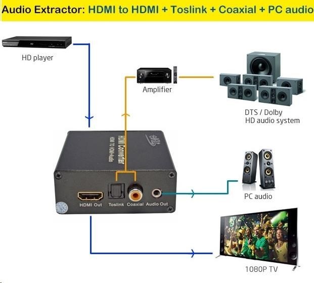 - Vyvede z HDMI audio signál na konektory: stereo jack, Digitální audio RCA CINCH nebo digitální optické TOSLINK