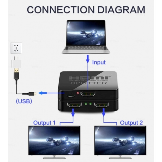 HDMI Video Splitter 1 => 2 Porty, 3D, 4K x 2K,  FULL HD s napájením z USB