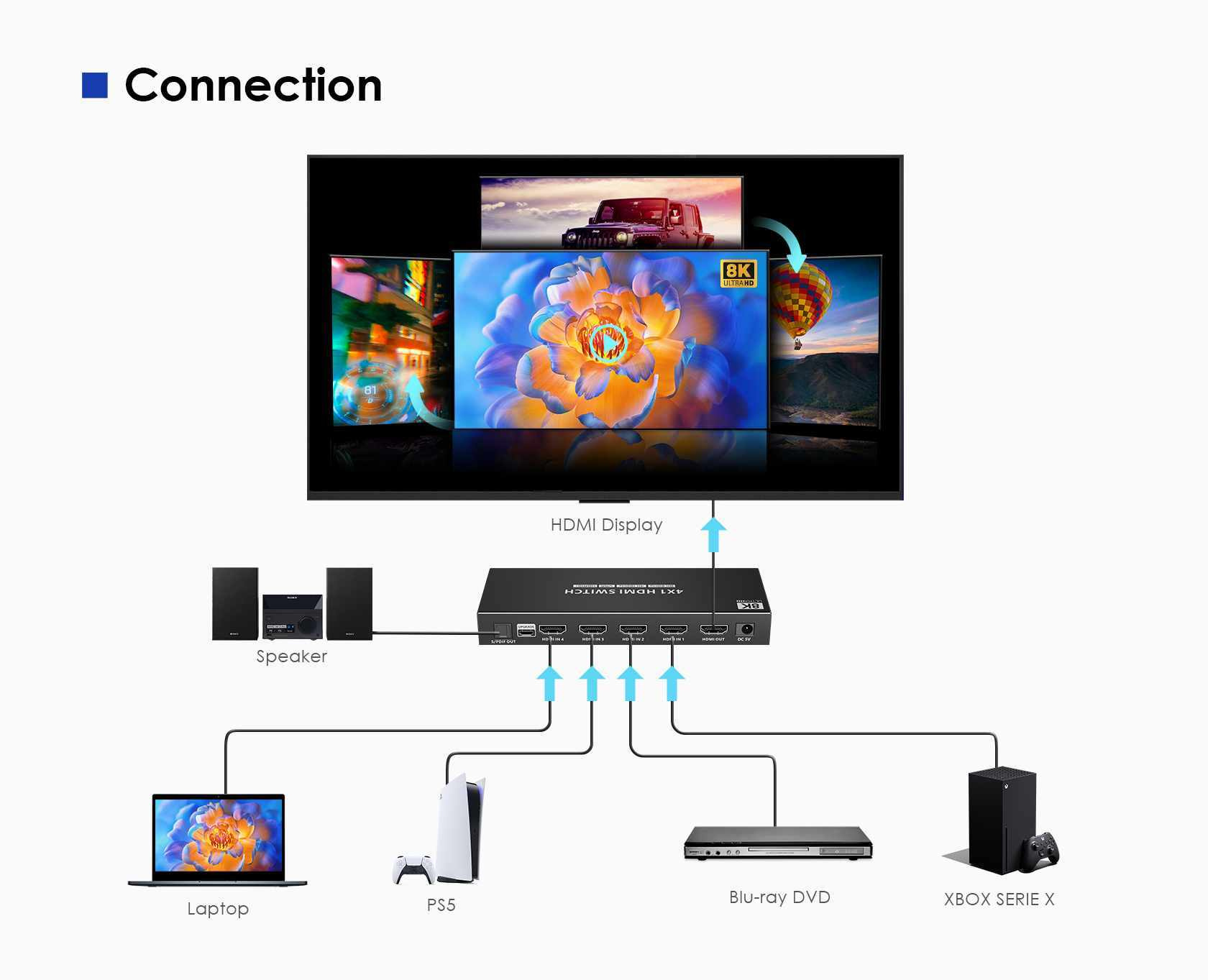 PremiumCord HDMI switch 4:1 s podporou rozlišení 8K@60Hz,4K@120Hz, 1080P, HDR, s dálkovým ovladačem