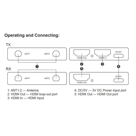 - Bezdrátový vysílač a přijímač signálu HDMI umožňuje připojit HDMI monitor nebo promítačku na vzdálenost až 200m na otevřeném prostranství.