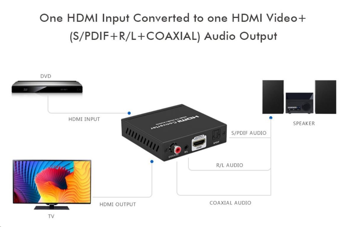 - Vyvede z HDMI audio signál na konektory: stereo jack, Digitální audio RCA CINCH nebo digitální optické TOSLINK