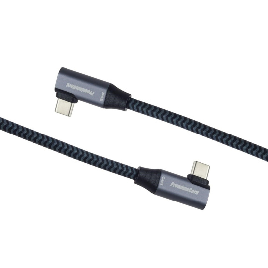 PremiumCord USB-C 2x zahnutý 90° kabel ( USB 3.2 GEN 2x2, 5A, 100W, 20Gbit/s ) hliníkové krytky konektorů, bavlněný oplet, 1m