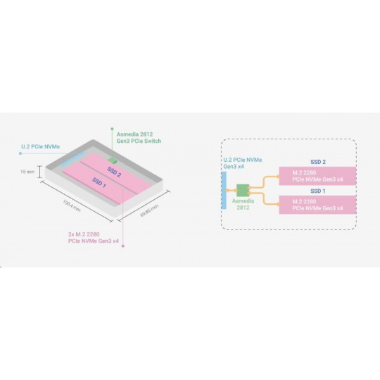 Produkt QDA-U2MP dokáže pojmout dva M.2 PCIe 3.0 x4 NVMe SSD uvnitř jedné 2,5” diskové pozice U.2 (SFF-8639) PCIe 3.0 x4 NVMe SSD. Pro QDA-U2MP není nutný žádný softwarový ovladač a lze jej nainstalovat do počítače/pracovní stanice (Windows®, Linux®) nebo QNAP NAS, kde umožňuje použít místo nákladnějšího U.2 SSD dostupnější M.2 SSD.