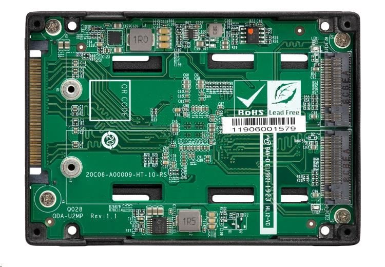 Produkt QDA-U2MP dokáže pojmout dva M.2 PCIe 3.0 x4 NVMe SSD uvnitř jedné 2,5” diskové pozice U.2 (SFF-8639) PCIe 3.0 x4 NVMe SSD. Pro QDA-U2MP není nutný žádný softwarový ovladač a lze jej nainstalovat do počítače/pracovní stanice (Windows®, Linux®) nebo QNAP NAS, kde umožňuje použít místo nákladnějšího U.2 SSD dostupnější M.2 SSD.