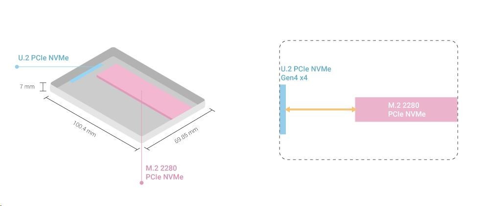 Lehký QDA-UMP4A umožňuje nainstalovat M.2 PCIe NVMe SSD do 2,5” slotu pro U.2 (SFF-8639) PCIe NVMe SSD zařízení QNAP NAS. (M.2 SSD se prodává samostatně)