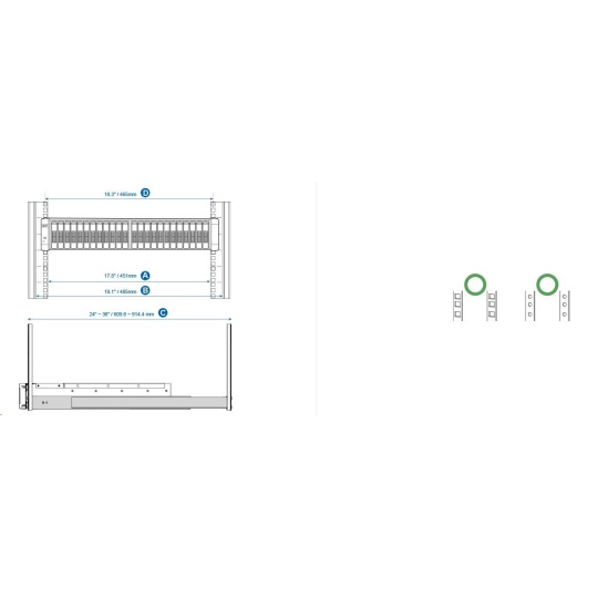 Sady kolejnic QNAP Rail Kits pomáhají při instalaci QNAP NAS do racku. Posuvné kolejnice umožňují zasunutí QNAP NAS dovnitř a vysunutí ven pro snadnou údržbu a správu. Modely QNAP NAS určené do racku vyhovují standardům rackové montáže ANSI/EIA-RS-310-D. Než nakoupíte serverový rack, nejprve se prosím ujistěte, zda tento serverové rack odpovídá příslušným specifikacím.
