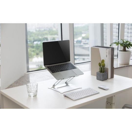 ERGOnomický hliníkový stojan na laptopy nebo tablety max 5kg pro dosažení optimálního nastavení náklonu a výšky 11-15" monitoru, přenosné provedení na stůl s protiskluzovými plochami a otvory pro ventilaci, pro použití externí klávesnice, rozměry 26x23x16 cm, barva stříbrná.