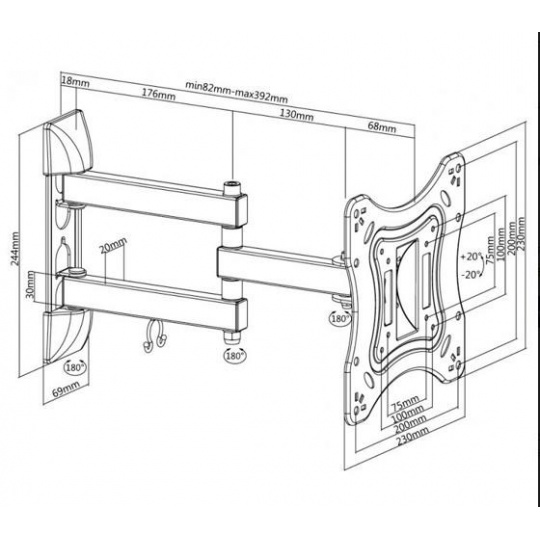 Nástěnný ocelový držák na LCD monitory a TV s uhlopříčkou 23"- 42" (58-107cm) a hmotností maximálně 20kg. 3x pant, vertikálně výklopný +20°/-20° a horizontálně otočný +90°/-90°, vzdálenost od stěny 82-392mm, materiál ocel, barva černá. Uchycení VESA: 75x75, 100x100, 100x200, 200x200..