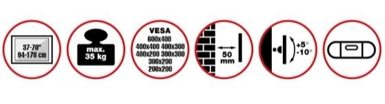 Nástěnný ocelový držák SLIM s minimální vzdáleností od stěny na Plasma a LCD TV s uhlopříčkou 37"- 70" (94-178cm) a hmotností maximálně 35kg. Středová konzole na zavěšení TV s upevněnými držáky, vertikálně výklopný +5°/-10°, vzdálenost od stěny 50mm, materiál ocel, barva černá. Uchycení VESA: 200x200, 300x200, 300x300, 400x200, 400x300, 400x400, 600x400..