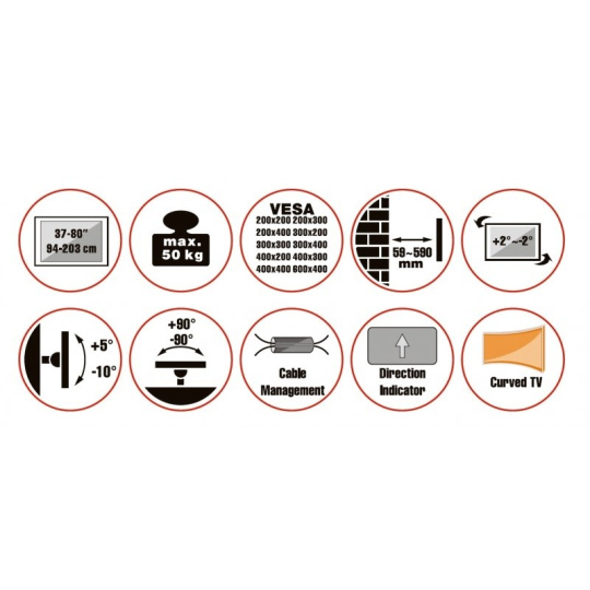 Nástěnný ocelový držák s bočním natáčením na TV s uhlopříčkou 37"- 80" (109-203cm) a hmotností maximálně 50kg. VESA max 600x400, 3x pant, vertikálně výklopný +5°/-10° a horizontálně otočný +90°/-90°, vzdálenost od stěny 59-590mm, Cable Managment, barva bílá. Uchycení VESA: 200x200, 300x200, 400x200, 300x300, 400x300, 400x400, 600x400. Direction indikátor, jemné nastavení polohy oproti fixaci ve zdi +2°/-2°, rozměry 590 x 730 x 445 mm..