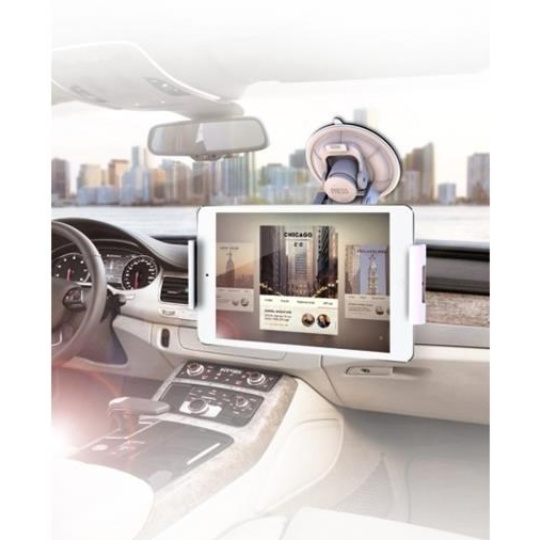 Držák pro tablety 7-11" v horizontální i vertikální poloze do auta na přední sklo. Přísavný adapter na sklo s kulovou hlavou pro volné nastavení, otočný o 360°, fixace ze dvou stran, plastové provedení, bílý..