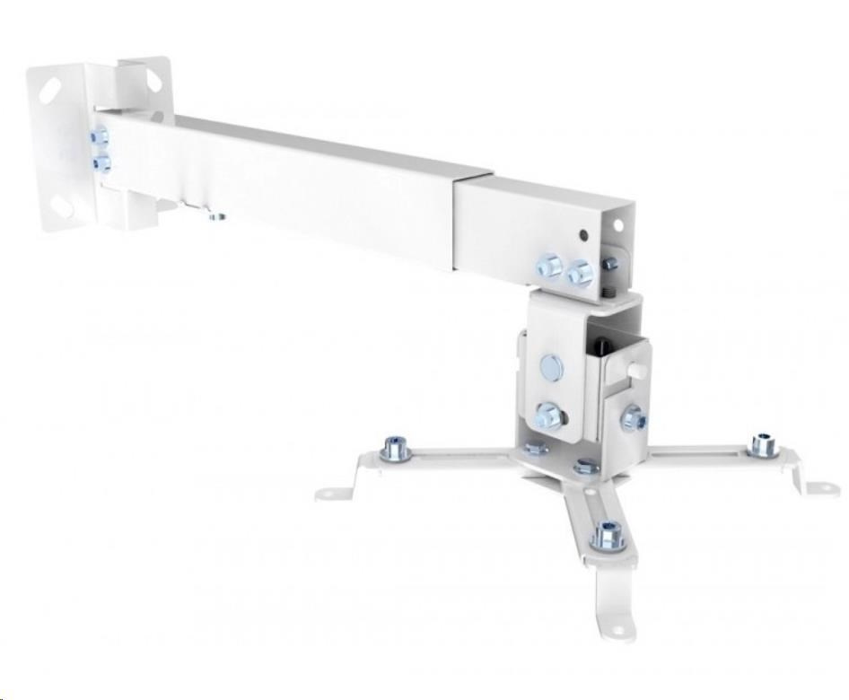 Stropní a nástěnný držák na dataprojektory - vzdálenost od stropu 43-65cm nebo stěny 35-56cm, přístroj nelze otáčet, lze naklonit +/- 8° bočně a +/- 15° ve směru, maximální zatížení 20kg, bílý. Univerzální systém uchycení dataprojektorů (rozsah 22,5-31,5 cm)..