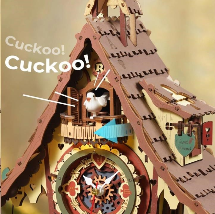 Kukačkové hodiny jako z pohádky! Ukazují přesný čas, okouzlí Vás hravými detaily a přinášejí krásu tradičního řemesla. Představují lesní chaloupku ukrytou v kouzelném lese, doplněnou točícím se vodním kolem, dřevěným plotem a zahrádkou. Hodiny mají kukačku, kyvadlo ve tvaru půlměsíce, doškovou střechu a mnoho dalších prvků. Mezi hravé detaily patří symboly karetních motivů na střeše i ciferníku. Skrytý přepínač jako součást schodů umožňuje spustit zvuk kukačky nebo nastavit hodinový zvukový režim. Po zapnutí hodinového režimu vykoukne každou celou hodinu veselá kukačka z okénka, roztáhne křídla a zazpívá jemnou melodii. Zvuk kukačky a hodinový mechanismus jsou elektronicky propojeny. Skládačka využívá quartzový strojek řízený křemenným krystalem, který zajišťuje vysokou přesnost. Časový signál z hodinového strojku je spolehlivě přenášen do mechanismu kukačky. Teplé tóny osvětlení prozáří každý kout a vytvoří kouzelnou pohádkovou atmosféru.