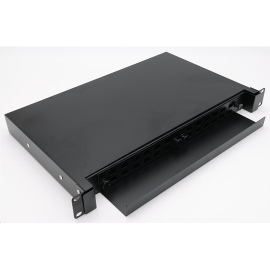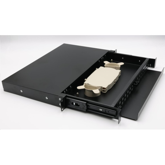 19" rozvaděč, výška 1U, pro 24 simplex adaptérů SC nebo duplexních LC, barva černá, kovová skříň, kazeta na svarky. Vana se vysouvá pomocí pojezdových kolejnic.