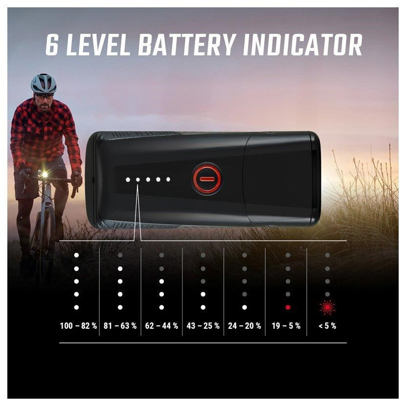 LED kontrolky šestistupňového indikátoru baterie během jízdy neustále přesně signalizují, kolik energie ještě zbývá. Ve vypnutém stavu stačí pro zjištění stavu baterie krátké stisknutí tlačítka On/Off. Lithium-iontovou baterii lze dobít kabelem USB-C do 3 hodin. Indikátor nabíjení v pěti stupních ukazuje, jak daleko proces nabíjení pokročil.