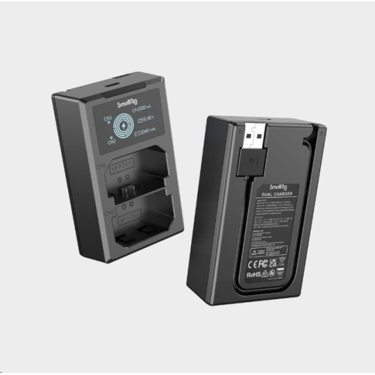 Duální nabíječka dokáže nabíjet dvě baterie současně, přičemž její LCD displej zobrazuje stav nabíjení v reálném čase.