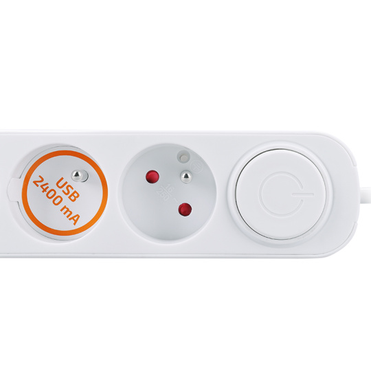 Solight 3z prodlužovací přívod s USB A+C nabíječkou 2.4A, 2m, 3 x 1mm2, bílý, vypínač
