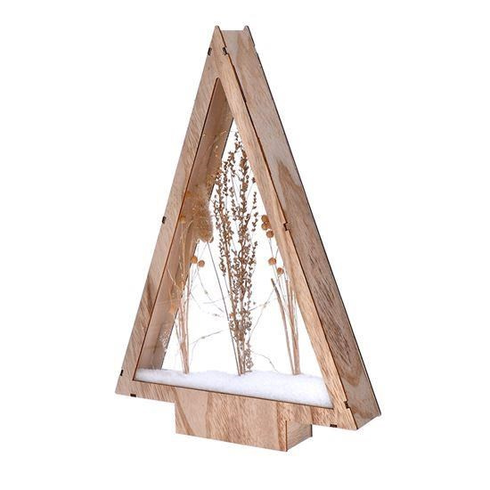 Přírodní, vánoční dřevěná dekorace ve tvaru vánočního stromku se zasněženými zimními květinami, podsvícené tenkým LED řetízkem