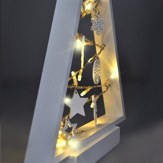 LED dřevěný vánoční stromek s ozdobami počet LED diod: 15 počet ozdob: 7 barva světla: teplá bílá (žlutá) napájení: 2 x AA baterie (nejsou součástí) výdrž baterií: cca 75hodin (v závislosti na kvalitě baterií) třída ochrany: IP20 (vnitřní použití) rozměr: 37 x 25cm barva: bílé dřevo balení: barevná krabice.