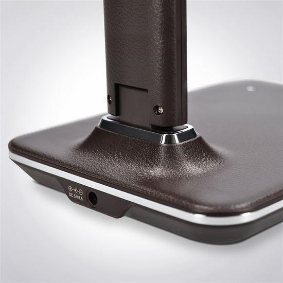stolní lampička s LED světelným zdrojem a designem hnědé kůže