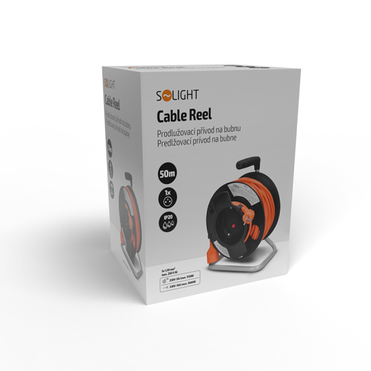 Solight prodlužovací přívod na bubnu, 1 zásuvka, 50m, oranžový kabel, 3x 1,5mm2