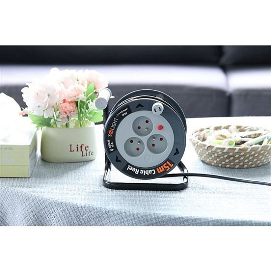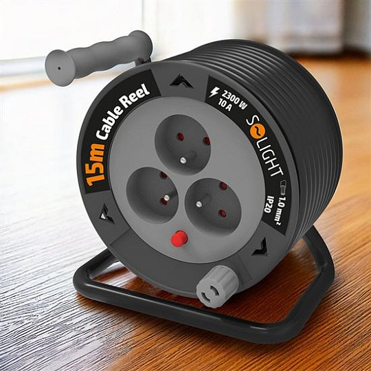 Solight prodlužovací přívod na bubnu 15m, 3 zásuvky, černý kabel, 3x 1,0mm2