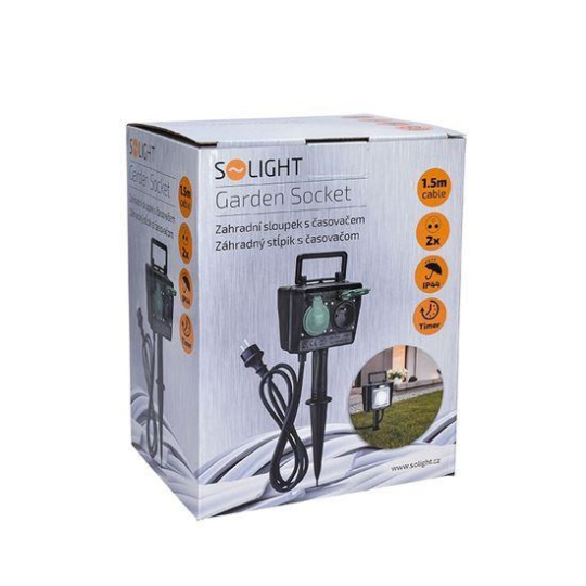 Solight zahradní sloupek IP44, 2 zásuvky + časový spínač, gumový kabel 1,5m