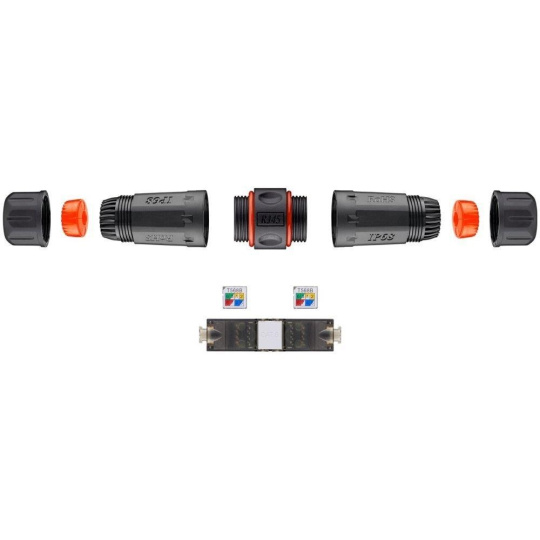 Propojovací stíněná voděodolná spojka pro rozvody Cat5e/6/6a. Určeno pro prodloužení segmentů okonektorovaných kabelů. Vhodná pomůcka pro exteriérové instalace aktivních outdoor prvků, a jejich snadnou montáž a demontáž v hůře přístupných místech.