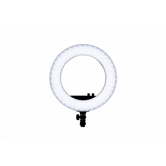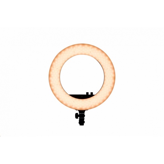 Stmívatelné dvoubarevné LED kruhové světlo Nanlite Halo 18 s napájením pomocí AC adaptéru. Součástí balení je také držák na telefon a oboustranné make-up zrcátko.