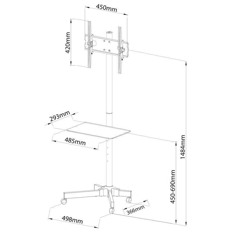 Stojan na televize i monitory 23-55", VESA 75x75 až 400x400, nastavení výšky 1000-1484mm, naklápění +/-15°, polička 485x293mm, kolečka s aretací, vedení kabelů, nosnost 25kg.... více