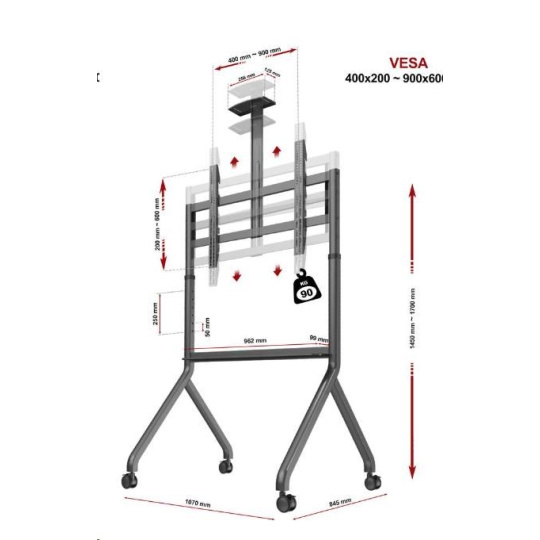 Mobilní stojan pro multimediální tabule, interaktivní monitory a LCD LED TV 60" - 100" Model: NB P200G Stojan na interaktivní tabuli P200G Charakteristika: Univerzální mobilní televizní vozík / stojan pro velké obrazovky Perfektní řešení pro interaktivní tabule a multimediální obrazovky Široká, stabilní základna se snadným přístupem k dotykovým obrazovkám Nastavení výšky obrazovky Vysoce kvalitní materiály mají za následek velmi pevnou a odolnou konstrukci Výškově nastavitelná police na fotoaparát, kameru nebo jinou AV techniku Přídavná police pod zástěnou na příslušenství Plná shoda se standardem VESA Jednoduchá a rychlá montáž Ideální pro konferenční místnosti, školy, výstavy i pro soukromé použití Čtyři otočná gumová kolečka s funkcí aretace Vysoká nosnost, skvělá stabilita Stojan na multimediální tabule a multimediální dotykové monitory P200G TECHNICKÉ PARAMETRY Maximální nosnost 90,9 kg Pro obrazovky 60" - 100" Výškové nastavení v rozsahu 145 ~ 170 cm (každých 5 cm) Gumová otočná kolečka o průměru 75 mm s funkcí aretace Pevná ocelová konstrukce Nastavitelná police na fotoaparát nebo jinou AV techniku, rozměry: Rozměr 256 x 125 mm Spodní police na příslušenství, rozměry: 962 x 99 mm Povrchová úprava: práškový lak Barva: grafitová Standard kompatibilní s VESA (rozteč montážních otvorů): VESA 200x200 (rozteč otvorů 200 x 200 mm) VESA 300x200 (rozteč otvorů 300 x 200 mm) VESA 300x300 (rozteč otvorů 300 x 300 mm) VESA 400x200 (rozteč otvorů 400 x 200 mm) VESA 400x400 (rozteč otvorů 400 x 400 mm) VESA 600x400 (rozteč otvorů 600 x 400 mm) VESA 800x400 (rozteč otvorů 800 x 400 mm) VESA 800x500 (rozteč otvorů 800 x 500 mm) VESA 800x600 (rozteč otvorů 800 x 600 mm) VESA 900x600 (rozteč otvorů 900 x 600 mm).