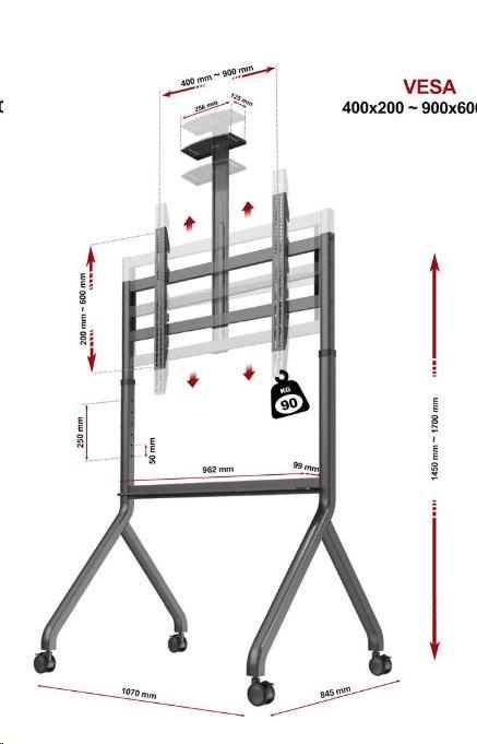 Mobilní stojan pro multimediální tabule, interaktivní monitory a LCD LED TV 60" - 100" Model: NB P200G Stojan na interaktivní tabuli P200G Charakteristika: Univerzální mobilní televizní vozík / stojan pro velké obrazovky Perfektní řešení pro interaktivní tabule a multimediální obrazovky Široká, stabilní základna se snadným přístupem k dotykovým obrazovkám Nastavení výšky obrazovky Vysoce kvalitní materiály mají za následek velmi pevnou a odolnou konstrukci Výškově nastavitelná police na fotoaparát, kameru nebo jinou AV techniku Přídavná police pod zástěnou na příslušenství Plná shoda se standardem VESA Jednoduchá a rychlá montáž Ideální pro konferenční místnosti, školy, výstavy i pro soukromé použití Čtyři otočná gumová kolečka s funkcí aretace Vysoká nosnost, skvělá stabilita Stojan na multimediální tabule a multimediální dotykové monitory P200G TECHNICKÉ PARAMETRY Maximální nosnost 90,9 kg Pro obrazovky 60" - 100" Výškové nastavení v rozsahu 145 ~ 170 cm (každých 5 cm) Gumová otočná kolečka o průměru 75 mm s funkcí aretace Pevná ocelová konstrukce Nastavitelná police na fotoaparát nebo jinou AV techniku, rozměry: Rozměr 256 x 125 mm Spodní police na příslušenství, rozměry: 962 x 99 mm Povrchová úprava: práškový lak Barva: grafitová Standard kompatibilní s VESA (rozteč montážních otvorů): VESA 200x200 (rozteč otvorů 200 x 200 mm) VESA 300x200 (rozteč otvorů 300 x 200 mm) VESA 300x300 (rozteč otvorů 300 x 300 mm) VESA 400x200 (rozteč otvorů 400 x 200 mm) VESA 400x400 (rozteč otvorů 400 x 400 mm) VESA 600x400 (rozteč otvorů 600 x 400 mm) VESA 800x400 (rozteč otvorů 800 x 400 mm) VESA 800x500 (rozteč otvorů 800 x 500 mm) VESA 800x600 (rozteč otvorů 800 x 600 mm) VESA 900x600 (rozteč otvorů 900 x 600 mm).