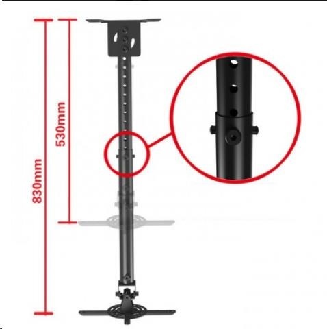 Stropní držák na projektory Fiber Mounts T718-2 černý Držák na projektory, univerzální, otočný, sklopný, délkové nastavení, barva černá Kvalitní stropní držák pro zavěšení všech typů projektorů s hmotností do 13,6kg. Plná nastavitelnost polohy projektoru - nastavení vzdálenosti od stropu 53÷83cm, otáčení do stran, náklon v obou osách, možnost uchycení i na šikmé stropy. Vynikající kvalita, pěkný design. Barevné provedení černé. Fiber Mounts NBT718-2 stropní držák na projektory v černém provedení, otočný, sklopný, délkově nastavitelný, i na šikmé stropy, TOP kvalita Technické údaje: max. zatížení 13,6kg na všechny typy projektorů s podporou zavěšení nastavitelná vzdálenost od stropu 530-830mm náklon +20° až -20° otáčení do stran +60° až -60° korekce roviny projektoru +20° až -20° možnost přetočení úchytu z vodorovné pozice do svislé podporuje 3-bodové i 4-bodové zavěšení projektoru profesionální kvalita snadná nastavitelnost montážní materiál součástí balení krásný design barva černá záruka 5 let.